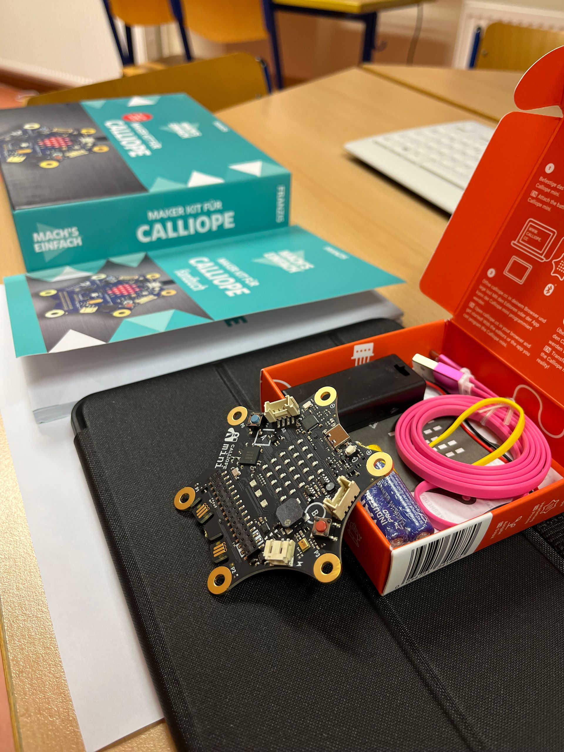 Bei der Einrichtung, die Dank der Unterstützung des Vereins der Freunde und Förderer erst möglich wurde, wurde der Leitgedanke „den Schülerinnen und Schülern das Coden beizubringen“ in den Fokus gerückt. Neben der Podcast Station, dem Greenscreen und dem 3D Druck, ist es möglich, das Programmieren mit sich entwickelnder Schwierigkeit zu erlernen. Schülerinnen und Schüler der Erprobungsstufe werden auf spielerischer Ebene durch kleine Roboter abgeholt, die auf Farbcodes reagieren. Fortgeschrittene Schülerinnen und Schüler der Mittelstufe können mit interaktiven Platinen (Calliope III) ihr Wissen erweitern, indem sie via App, in einem sinnvoll geführten Baukastensystem, Schriftzüge (LED), Tonfolgen, Spiele o.ä. Wirklichkeit werden lassen können.